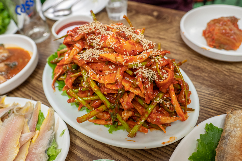 전국 어디서나 먹을 수 있는 ‘아삭아삭 새콤달콤한’ 회무침 맛을 기대하며, 그러니까 별다른 기대감 없이 반지회 한 젓가락을 집어 들고 입에 넣었는데, 우리는 약 0.5초 정도 서로의 눈을 동시에 마주 보았다. ‘앗, 뭔가가 달라. 지금까지 먹던 회무침과는 뭔가 다른 양념이야.’ <고독한 미식가>의 ‘고로’상이라면 눈을 동그랗게 뜨며 놀라는 표정을 지은 후 한 젓가락 더 입으로 가져가 눈을 지그시 감고서는 천천히 반지회무침을 씹었을 것이다. 이런 독백이 흘러나왔을 것이고. ‘와, 대단한 맛이야. 지금까지 먹어 왔던 회무침과는 비슷하지만 전혀 달라. 매운맛은 은근하면서도 묵직하군. 뒤에 따라오는 단맛은 결코 가볍지 않아. 반지에서 나오는 고소함은 끈기를 잃지 않고 끝까지 뒤를 받쳐 주는군.” 고개를 끄덕이는 고로상(줌인).