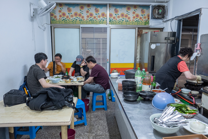 홍집의 내력은 이렇다. 주인 아주머니는 홍집 근처에서 조그만 슈퍼를 운영했었다. “원래는 이 집을 어느 각시가 했는데, 그 각시가 참 솜씨가 없었어. 손님들한테 음식을 대충대충 맛없게 해주니까 손님이 다 떨어지는 것이여.” 어느 날 그 각시가 아주머니에게 부탁을 했단다. 친정엄마가 돌아가셨는데, 대전 가서 초상 치르고 올 테니까 그때까지만 이 집 좀 맡아 주시라. “그래갖고는 내가 맡아서 억지로 했어. 근데 상 치르고 삼우제 치를 날도 지났는데 안 오는 것이여. 내가 뭐 술집을 할 줄 알았나. 안 오니까 계속 맡아서 한 거지.” 레이먼이 물었다. “아직도 안 온 거예요?” “응, 그때 가서는 이즉까지 안 와.” 우리 모두 “와~”. “벌써 40년이 넘었네, 그래.” 이어지는 아주머니의 이야기. “내가 손님을 왕창 잡았지. 장사를 잘 했어. 근데 나도 처음엔 음식을 제대로 할 줄 알았나. 그래서 어시장 가서 재료를 젤루 좋은 걸 사서 했지. 음식을 모르니 재료라도 좋은 걸 쓰자고 한 거지. 그랬더니 손님이 늘고 단골이 생기더라고. 지금이야 몇 집 없지만, 당시만 해도 이 장사가 많이 잘 됐거든. 그러니까 그게 벌써 한 40년 됐네.”