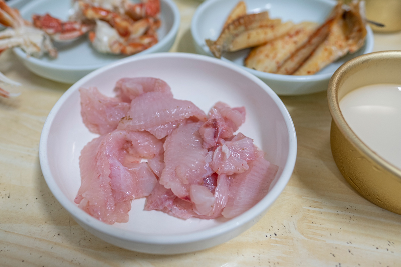 해성식당은 반지회의 원조 격이다. 20년 전, 근처의 다른 식당이 준치회를 낼 때 해성식당은 반지회를 냈고 준치가 귀해지면서 다른 식당들도 모두 반지회를 내기 시작했다고 한다. “그러니까 ‘반지’가 뭐냐고요!” 벽에 붙은 메뉴판을 보며 레이먼 김 셰프가 다시 물었다. 메뉴판에는 아구탕, 반지회, 반지회덮밥, 반지회무침, 백반이 올라 있었다. “처음 먹고 나서 너무 맛있어서 끼고 있던 반지까지 팔아서 먹는다고 해서 반지회야.” 내가 레이먼 김 셰프에게 말했다. “최갑수가 구라(?)는 참 잘 친다!” 옆에서 막걸리를 따르던 박찬일 셰프가 말했다. 초록색 탁자와 의자가 놓인 전형적인 백반집 실내풍경. 현지인으로 보이는 아저씨 몇 분이 테이블에서 양은쟁반 위에 밥과 여러 반찬 생선구이가 올라간 백반을 맛있게 먹고 있었다.
