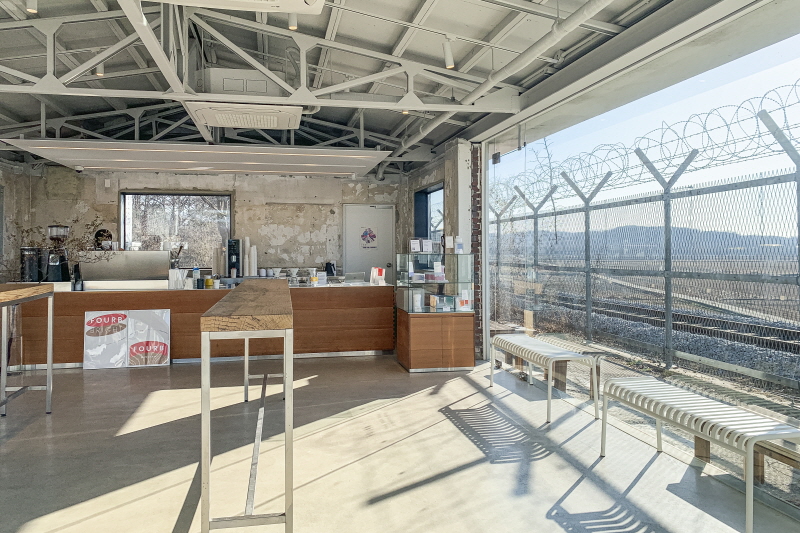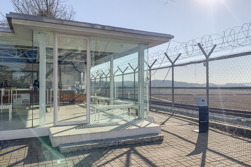밥을 먹고 자유로 드라이브 겸 커피를 마시러 가기로 했다. 파주에는 최북단 카페 ‘포비 DMZ’가 있다. 파주에서 라떼가 가장 맛있는 곳이다. 자유로를 끝까지 타고 가면 닿는다. 포비 DMZ는 사방이 통유리로 된 단층 건물이다. 건물을 보고 있노라면 우두커니 서 있다는 느낌이 든다. 아티스트가 설치한 작품 같기도 하다. 실내에는 2개의 스탠딩 테이블만 덩그러니 놓여있다. 건물 앞에는 철책이다. 여기는 파주. 어딜 가나 철책을 쉽게 볼 수 있다. 철책 너머로는 DMZ다. 포비DMZ에서는 커피를 마시며 철책 너머 비무장지대를 멍하니 바라볼 수 있다. 그러니까 이런 미니멀한 인테리어는 차분히 철책 너머 빈 공간을 바라보라는 포비 DMZ의 의도된 배려다.