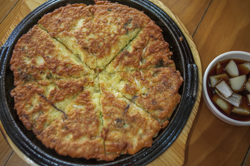 돼지기름으로 지진 오두산막국수의 빈대떡은 고소하고 바삭하다 |