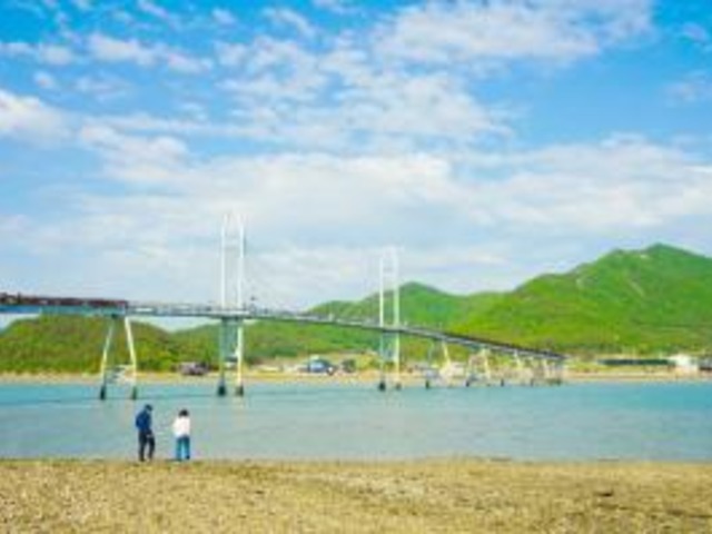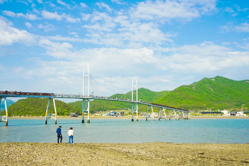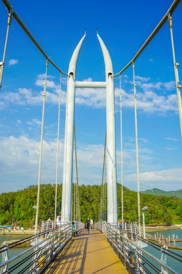 가우도 출렁다리를 배경으로 산책하는 연인 |