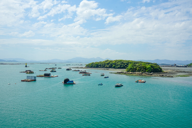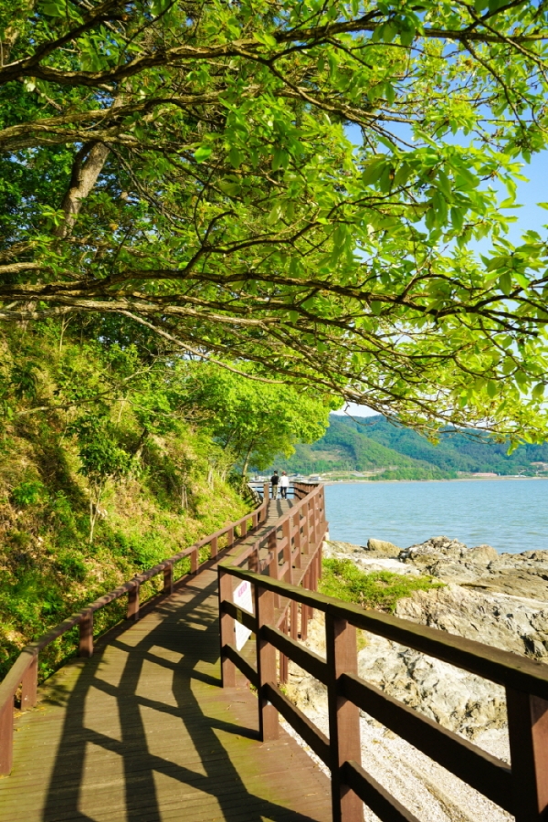 강진군은 바지 모양을 닮았다. 길게 뻗은 강진만이 육지를 파고드는 모양새 같기도 하다. 가우도는 대구면과 도암면으로 양팔을 뻗고 자리 잡았다. 대구면 출렁다리 입구에는 플라스틱 쓰레기로 만들어진 거대한 물고기 조형물이 있었다. “환경을 사랑하는 마음을 담아 쓰레기는 두고 가세요” 두 손 가볍게 산책에 나선다. 마침 하늘이 맑고 산이 푸르다. 여유롭게 산책하기 좋은 날씨다. 해안선을 따라 조성된 2.5km 생태탐방로는 남녀노소 누구에게나 열려있다. 편안한 나무데크와 머리 위로 우거진 초록 초록한 나무가 발걸음을 재촉했다.