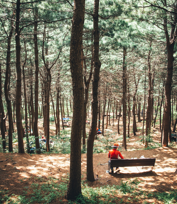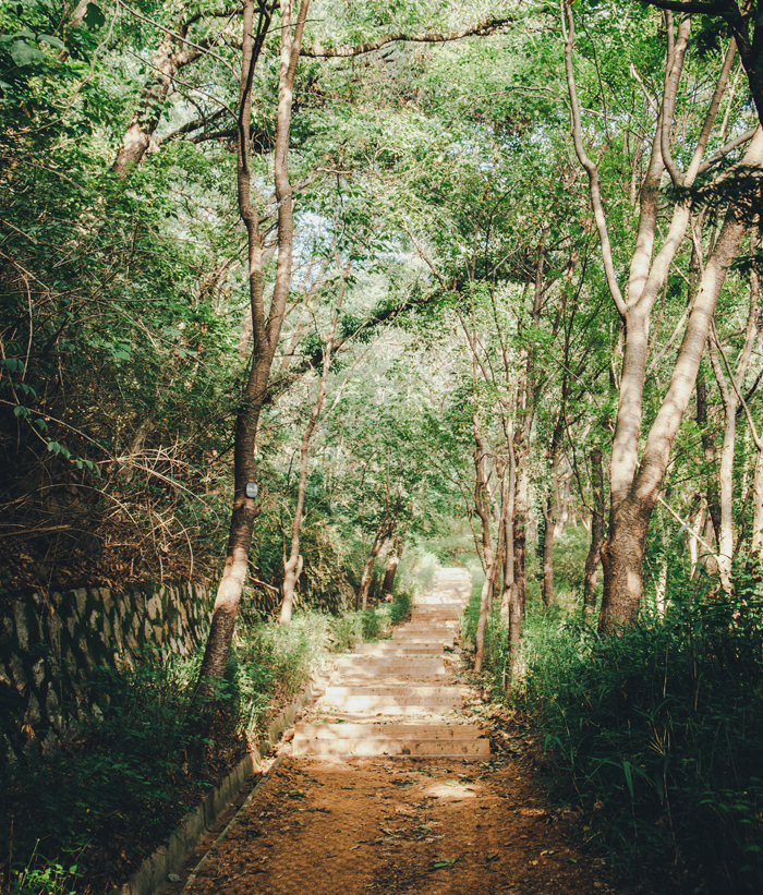 ‘숲에서 산책하거나 온몸을 드러내고 숲 기운을 쐬는 일’. 호암산 잣나무 삼림욕장에서라면 삼림욕의 정의를 몸소 경험해 볼 수 있다. 우선 ‘호압사’ 입구를 찾을 것. 호압사 주차장에서 호암산 폭포까지 이어진 호암늘솔길(‘언제나 솔바람이 부는 길’이라는 뜻)이 약 1.2km 가량 이어지는데, 잣나무 삼림욕장은 이 호암늘솔길 구간에 속한다.