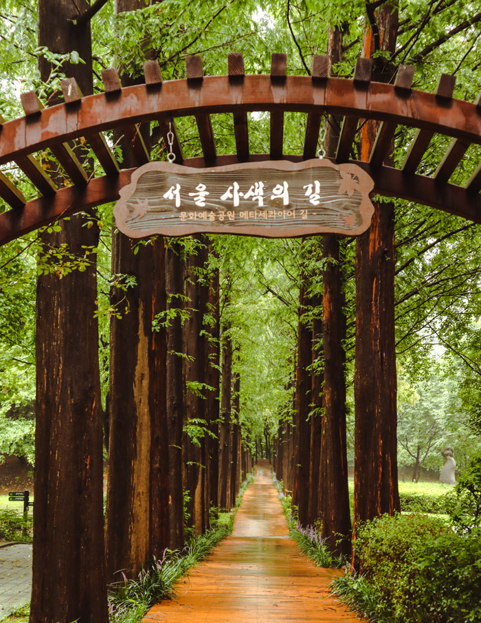 그중 가장 인기가 많은 메타세쿼이아 길은 양재시민의 숲 옆쪽에 위치한 서초예술공원 사색의 길이다. 숲속에 다양한 조각 작품이 있어 자연에 자리한 갤러리를 구경하는 느낌으로 둘러보면 좋다. 메타세쿼이아 길이 가장 아름다울 때는 가을이다. 메타세쿼이아가 붉게 물들면 그 잎이 땅에 떨어져 땅도 붉게 물든다. 한층 깊어진 가을의 색은 높아진 하늘의 푸른색과도 조화를 이룬다.
