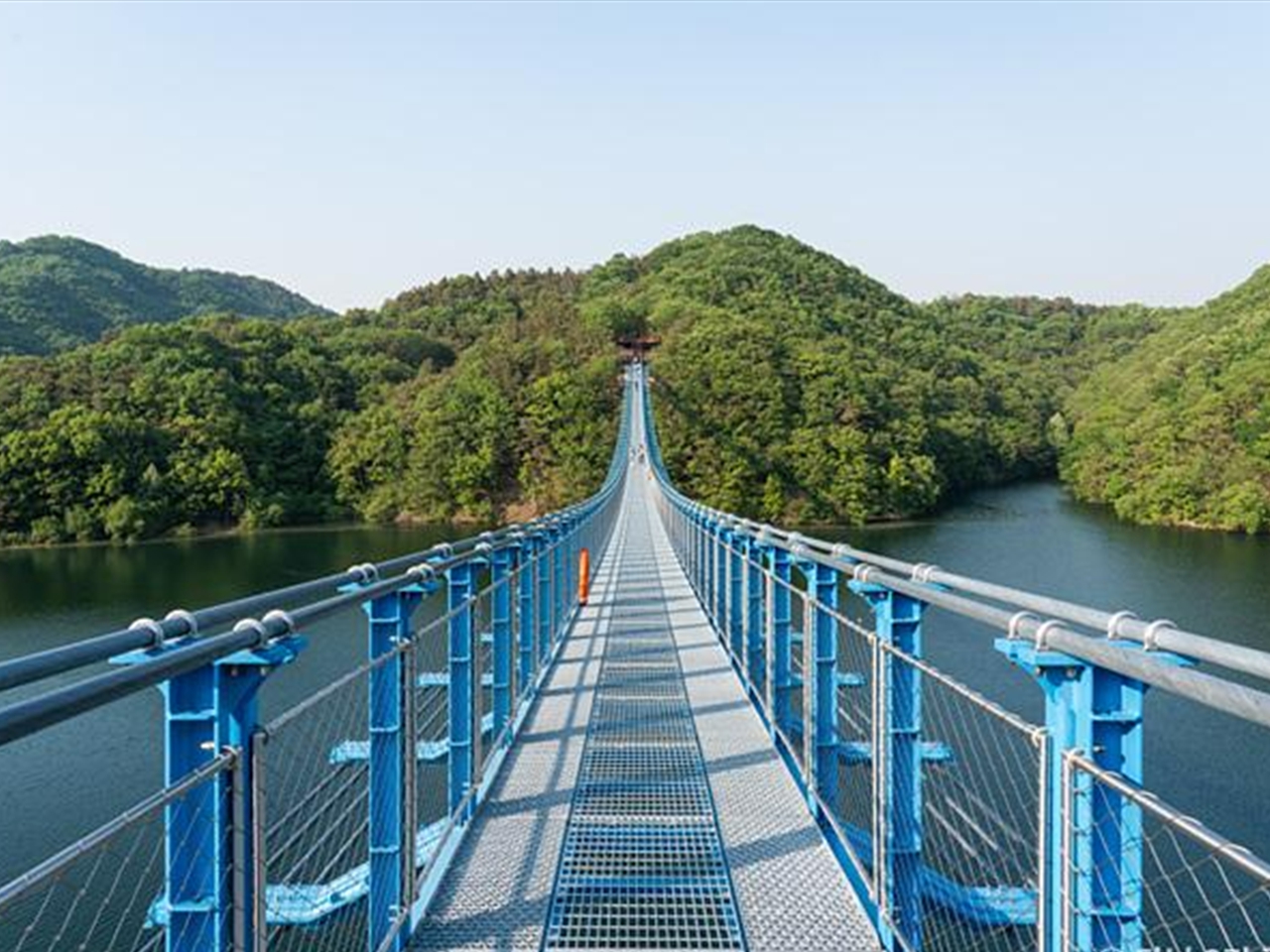 농다리에서 10분 정도만 가면 올해 4월에 개통한 '초평호 미르309 출렁다리'를 만날 수 있습니다. 총 길이 309m에 달하는 이 다리는 다리 중간에 주탑이 없는 구조로 설계되어 있는데요.