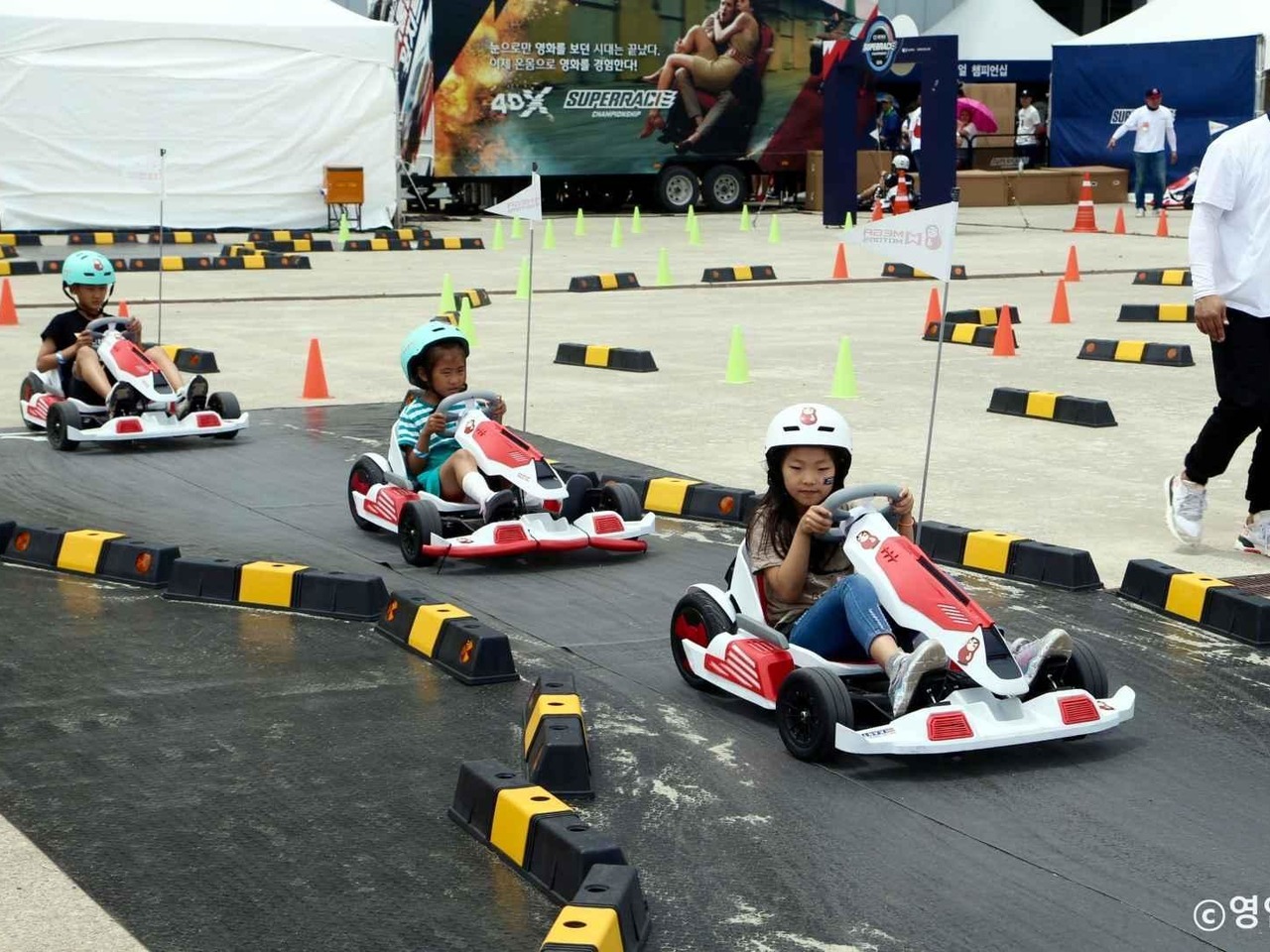 이제 본격적으로 카트를 타러 갈 시간이다. TV에서나 봤던 자동차 경주대회에 나온 F1 머신처럼 1, 2인용 카트 여러 대가 출발선에 줄을 맞춰 서 있다. 아이와 함께 2인용 카트에 타는 보호자는 페달이 있는 좌석에 앉으면 된다. 왼쪽 페달이 브레이크, 오른쪽이 액셀러레이터다. 운전대가 양쪽 시트 앞에 다 있어 아이도 직접 카트를 운전하는 것 같은 경험을 할 수 있다. 함께 온 친구, 또는 부모와 자녀가 카트를 나눠타며 빠르기를 겨뤄보자는 여행객들도 보인다.