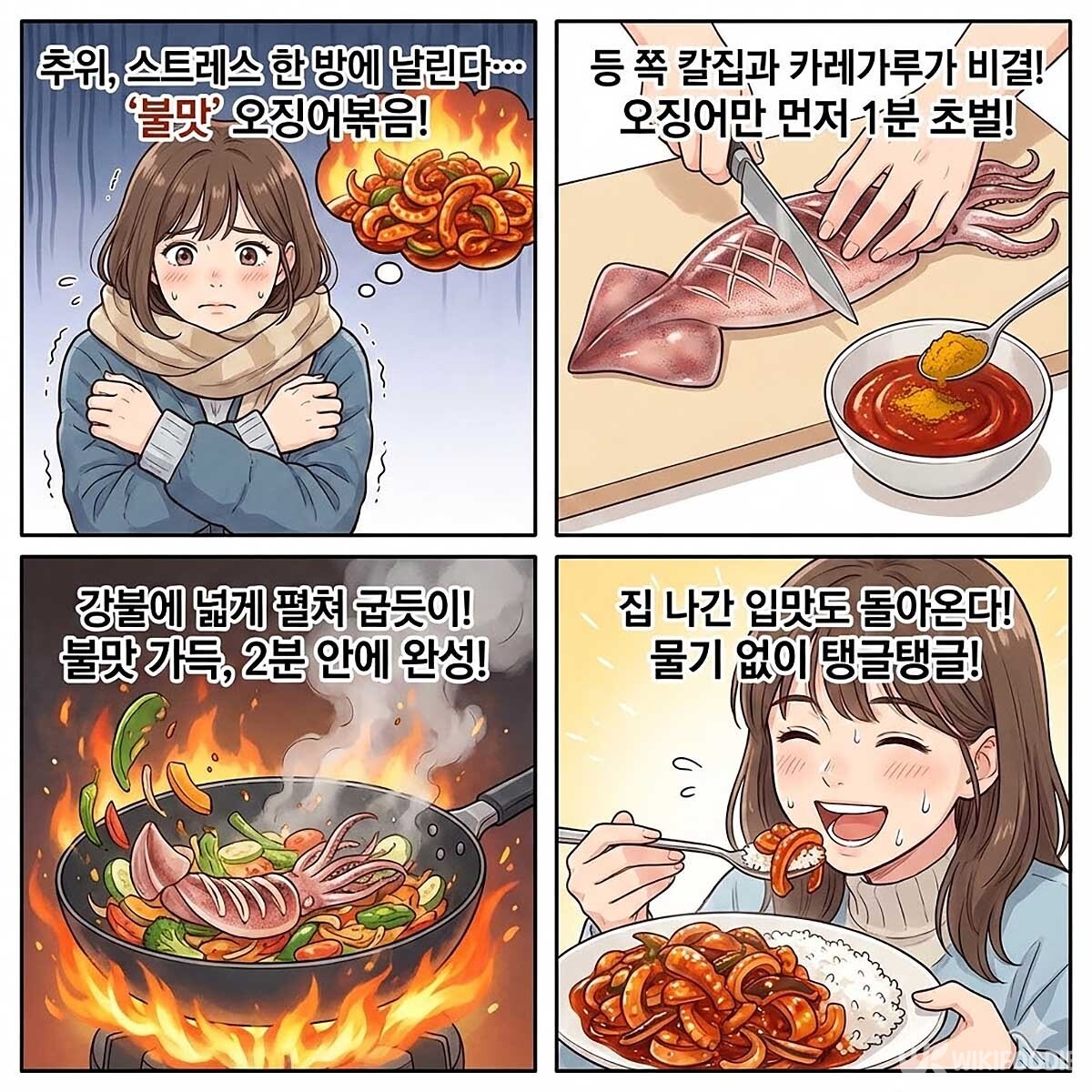 - 오징어는 오래 볶으면 질겨지므로 2분 내로 조리한다.