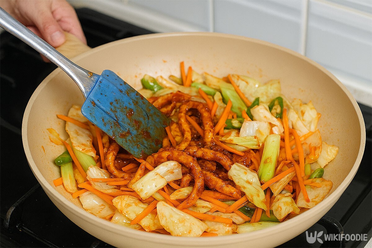 채소들을 볶다가 양념 된 오징어를 넣고 있다. / 위키푸디 |