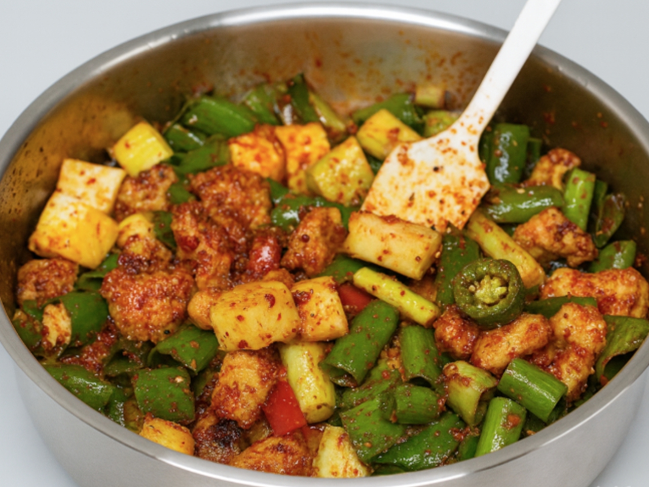 이때 고추가루 2스푼을 약불에서 볶아 고추기름을 만들어야 한다. 강한 불에서 하면 쉽게 타기 때문에 불 조절이 핵심이다. 여기에 대파 1대와 청양고추 3개를 넣어 향을 더한다. 양념을 볶은 뒤 고추장 4스푼, 양조간장 1스푼, 멸치액젓 1스푼을 넣어 고루 섞는다. 설탕 1스푼과 새우젓 건더기 1스푼까지 더해지면 국물의 바탕이 완성된다.