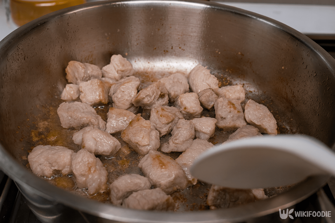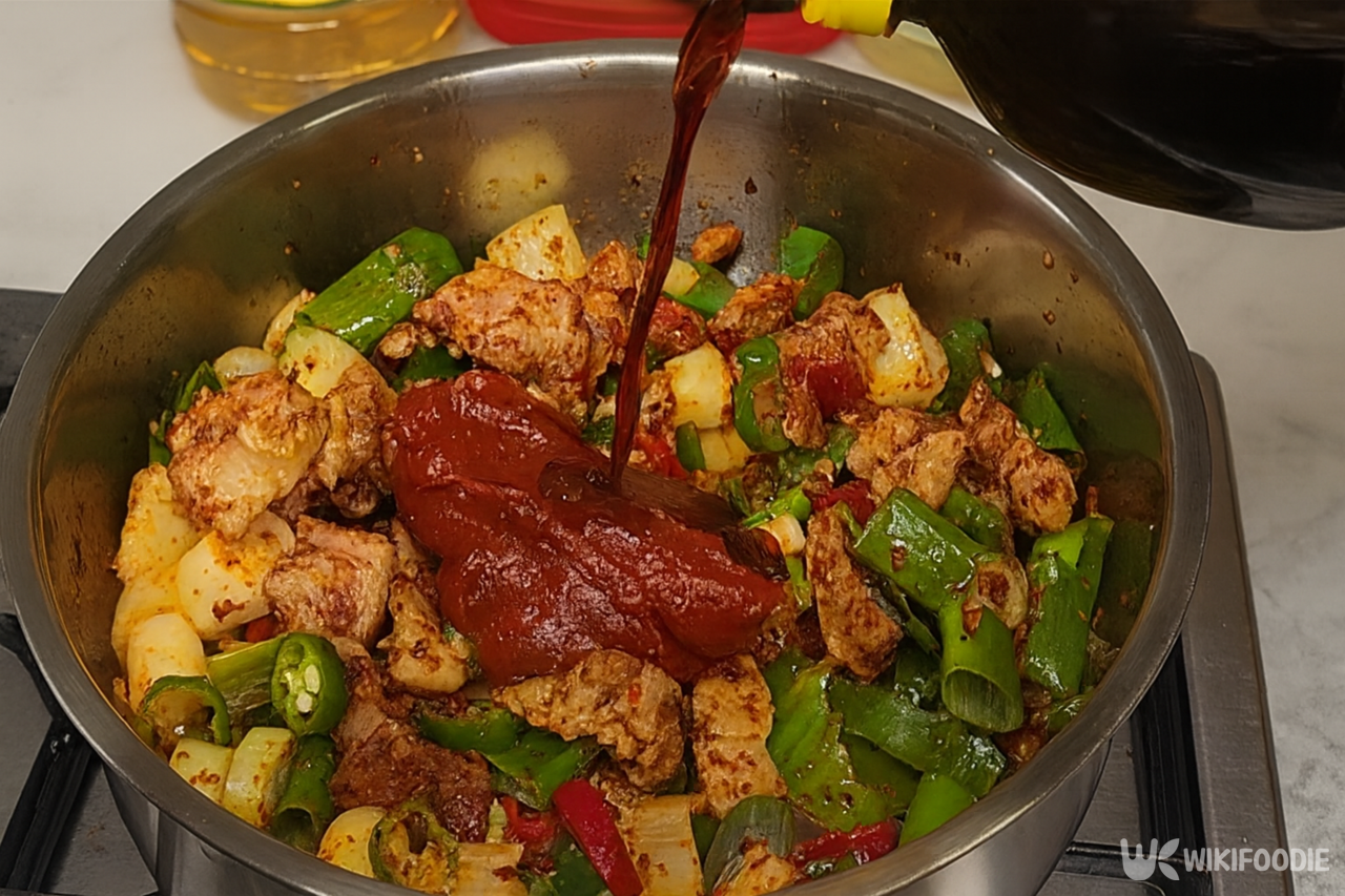 첫 단계는 삼겹살을 기름에 볶아 고소한 맛을 끌어내는 것이다. 삼겹살 300g에 소금 2~3꼬집을 뿌려 간을 살짝 한 뒤, 식용유 2스푼을 두른 냄비에서 노릇하게 볶는다. 이후 다진 마늘 1스푼과 편으로 썬 생강 3쪽을 넣어 볶으면 기본 향이 완성된다.