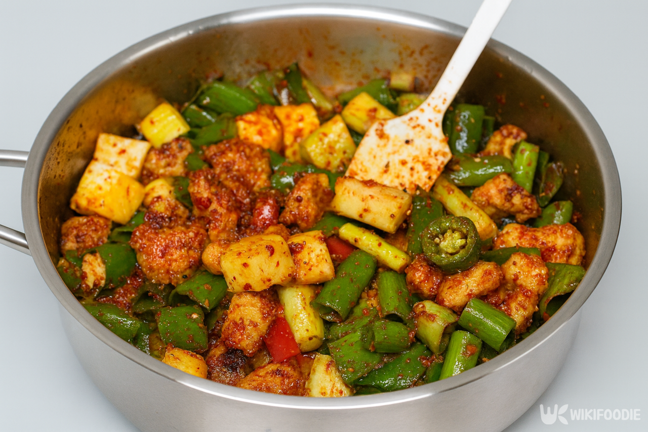 - 삼겹살은 노릇하게 볶아야 기름이 충분히 우러나 깊은 맛이 난다.