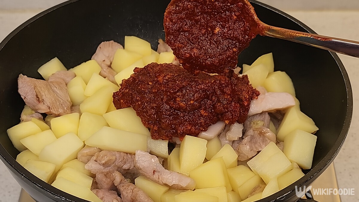 5. 양념장을 넣고 고기와 감자를 함께 볶는다.