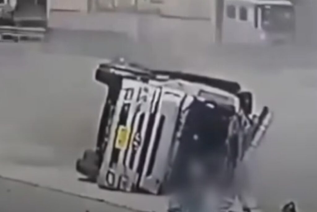 사고 당시 대형 철강 코일을 싣고 있던 화물차가 쓰러지자 일대에는 흙먼지가 날렸고 실려 있던 물건들도 일제히 바닥을 나뒹굴었다. 사고의 원인이라고 할 수 있는 흰색 캠핑카는 잠시 멈칫거렸으나, 그대로 사고 현장을 유유히 떠났다.