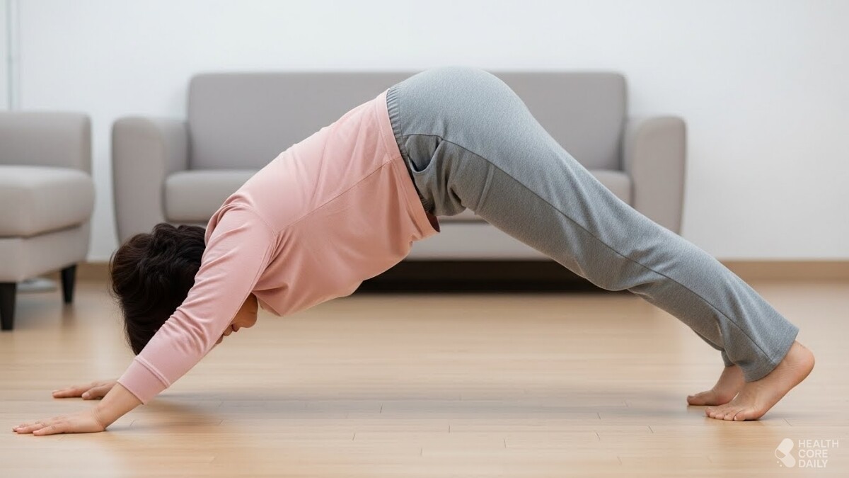 손과 무릎을 바닥에 대고 시작해, 호흡을 내쉬며 엉덩이를 천장 방향으로 들어 올려 몸을 역 V자 형태로 만든다. 손바닥으로 바닥을 밀어 어깨가 긴장되지 않도록 하고, 시선은 다리 쪽 바닥을 향하게 둔다. 햄스트링이 당길 경우 무릎을 살짝 구부려도 무방하다. 한 번에 30초~1분 정도 유지하며, 총 3분가량 반복하면 된다.