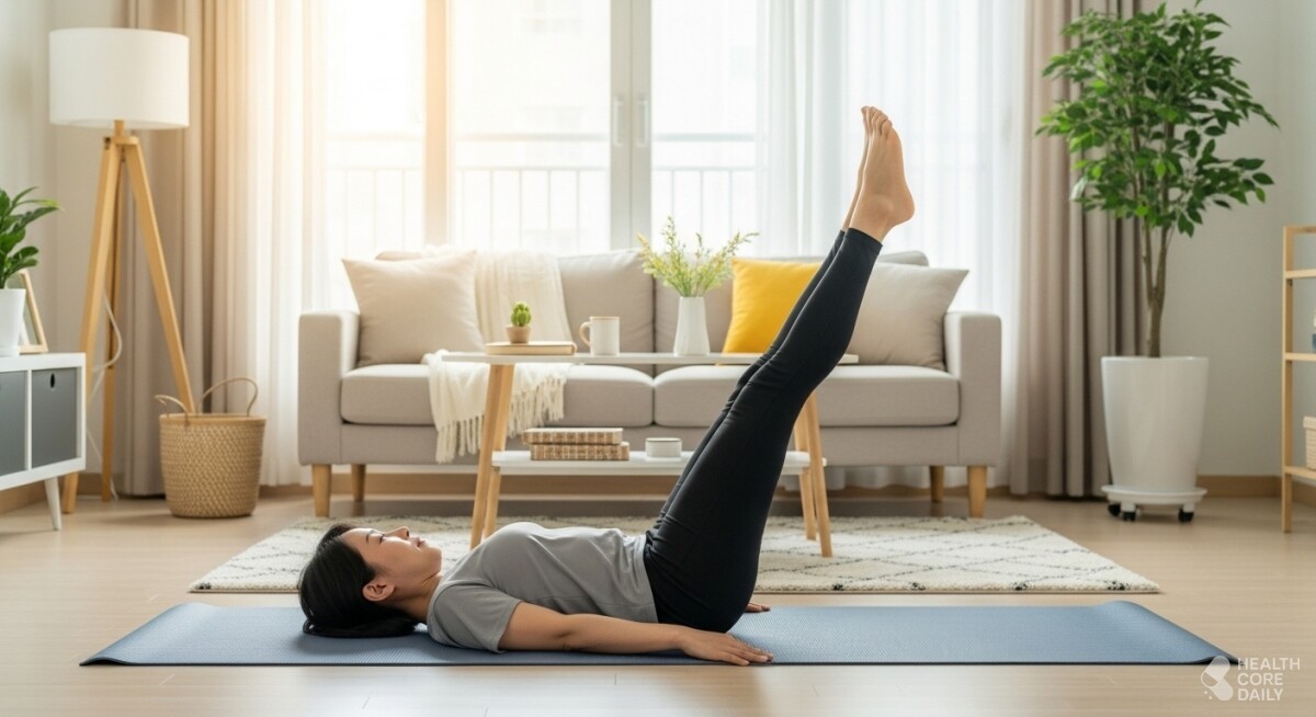 이 운동은 등을 바닥에 대고 누운 상태에서 허리가 들리지 않도록 복부에 힘을 주며 시작한다. 두 다리를 곧게 편 채로 천천히 들어 올려 바닥과 약 45도 정도 각도를 만든다. 복부의 긴장을 유지하며 이 자세를 20~30초간 버틴다. 이후 다리를 천천히 내리되, 발이 바닥에 닿지 않게 조심한다.