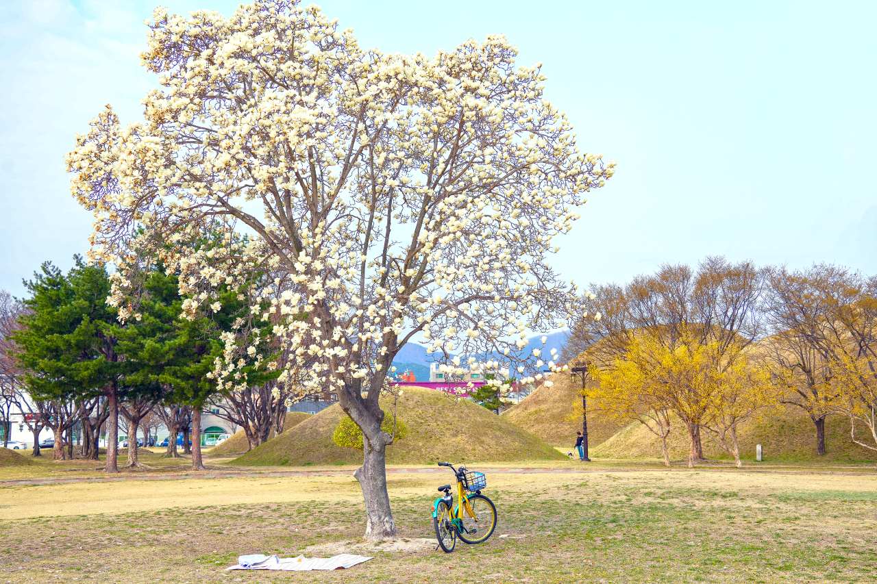 대릉원 길 건너편 노서동 고분군의 목련은 조금 더 생활 가까이에 닿아 있는 봄입니다. 담장 하나 없이 시가지와 이어져 있어, 현지인에게는 자연스러운 산책길이고 여행자에게는 숨은 보물 같은 장소가 되죠. 금관총을 비롯해 서봉총, 호우총 등 의미 있는 고분들이 모여 있어 걷는 동안 풍경이 단조롭지 않습니다.