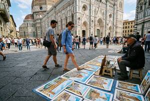 치안이 비교적 좋은 편인 피렌체에서도 여행자를 노리는 교묘한 수법이 있습니다. 바로 그림 사기인데요. 베키오 다리나 두오모 광장 같은 주요 명소 바닥에 그림을 넓게 펼쳐두고, 실수로 밟기를 기다리는 수법입니다. 그림을 밟는 순간, 발자국이 묻었다며 거액의 돈을 요구합니다.