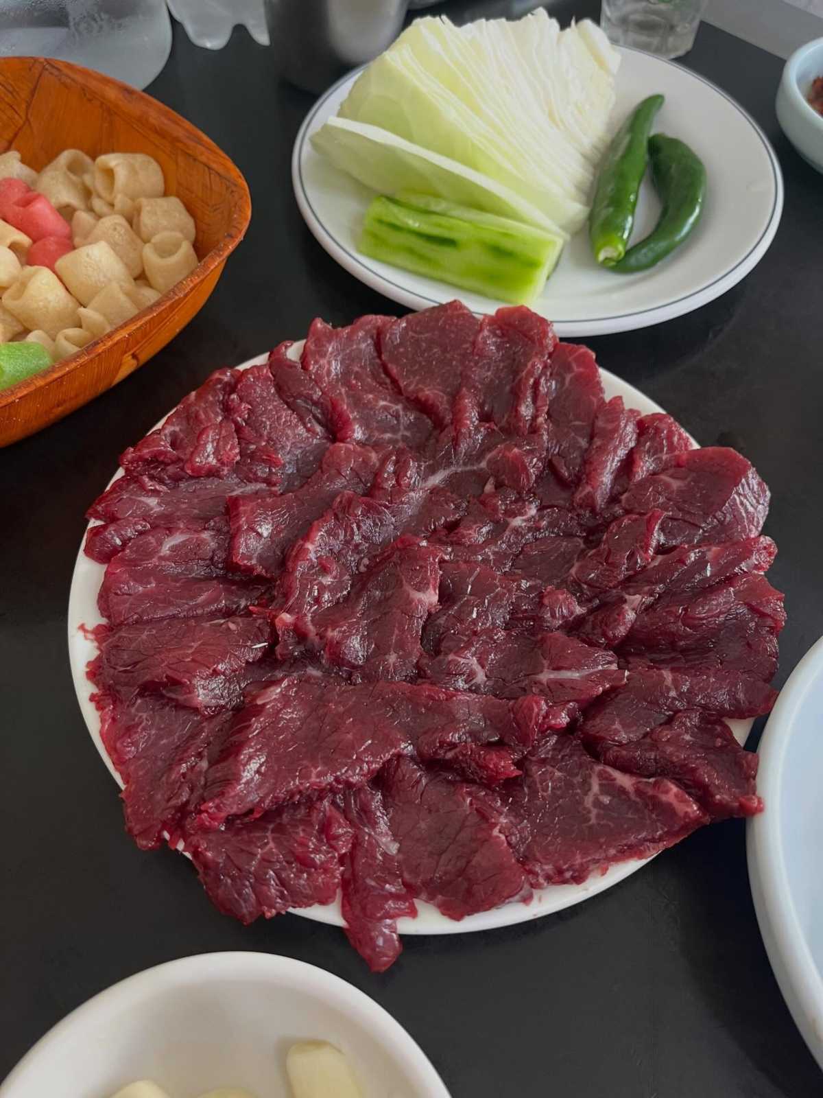 뭉티기는 우둔부위를 사용하는데, 진한 빛깔의 고기는 보기만해도 먹음직스럽다. 접시를 들어 올려보니 선홍빛 고깃덩어리들이 그릇에 착 달라붙어 떨어지지 않는다. 말랑말랑하면서도 탄력 있는 고기를 한 점 집어 특제 양념장에 푹 찍어 입에 넣으면, 처음엔 담백한 듯하다가 씹을수록 은근한 고소함과 감칠맛이 배어 나온다. 질기기는커녕 쫄깃하게 입 안에 감기는 식감이라, 천천히 곱씹을수록 그 참맛이 드러난다. 잡내 하나 없이 깔끔하고, 씹는 내내 육즙과 향이 입안을 맴돈다.