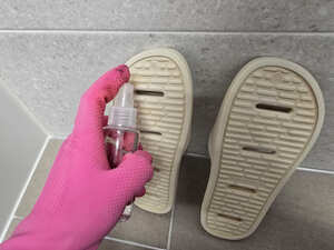 물 2와 식초 1 비율로 섞어 분무기에 담은 뒤 욕실화 바닥 전체와 틈새 홈에 듬뿍 뿌려준다. 식초 원액을 그대로 쓰면 고무 소재가 변색될 수 있으니 반드시 희석해서 사용해야 한다. 물 빠짐 홈 안쪽은 곰팡이가 가장 잘 숨는 곳이니 집중적으로 뿌려주는 것이 중요하다.